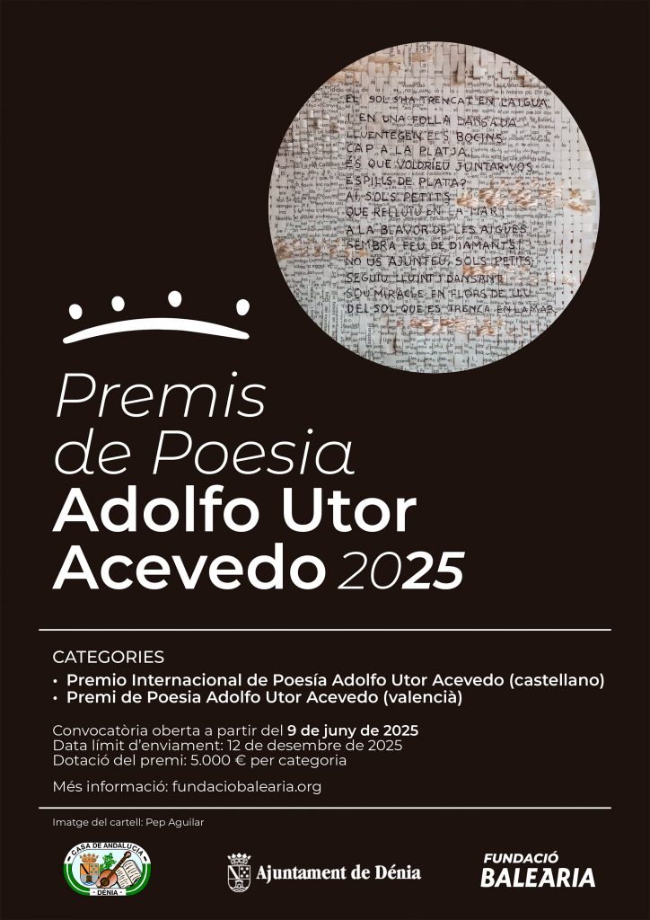 La Fundació Baleària i la Casa d’Andalucía de Dénia, en col·laboració amb l’Ajuntament de Dénia, en la seua constant voluntat de donar suport a la cultura i impulsar des de diferents vessants la creació artística en totes les disciplines, convoquen aquest premi amb la intenció de promoure la creació literària i, al mateix temps, posicionar aquest guardó de poesia com un referent de prestigi en les nostres lletres; un premi que vol retre homenatge al llegat i la memòria d’Adolfo Utor Acevedo, fortament compromès amb la paraula poètica i generós amb les diferents iniciatives que, al llarg de la seua vida, va possibilitar per fomentar les veus d’altres creadors artístics.