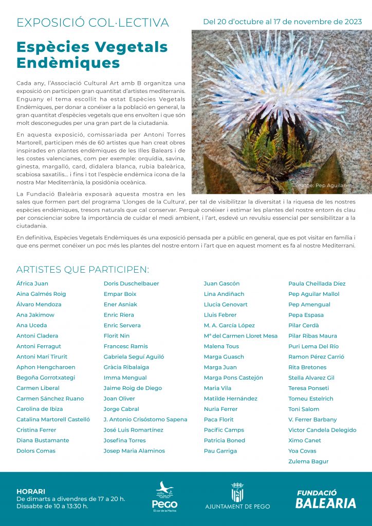 [:es]En esta exposición participan más de 60 artistas que han creado obras inspiradas en las plantas endémicas de las Islas Baleares y de las costas valencianas para visibilizar la diversidad y la riqueza de nuestras especies endémicas, tesoros naturales que hay que conservar. Porque conocer y estimar las plantas de nuestro entorno, es clave para concienciar sobre la importancia de cuidar el medio ambiente. Organizada por  la Asociación Cultural Arte con B y comisariada por Antoni Torres Martorell.  [:ca]En aquesta exposició participen més de 60 artistes que han creat obres inspirades en les plantes endèmiques de les Illes Balears i de les costes valencianes per tal de visibilitzar la diversitat i la riquesa de les nostres espècies endèmiques, tresors naturals que cal conservar. Perquè conéixer i estimar les plantes del nostre entorn, és clau per conscienciar sobre la importància de cuidar el medi ambient. [:]