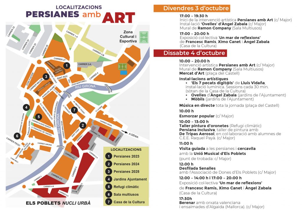 Persianes amb Art es una iniciativa de arte a pie de calle que transforma las persianas, un elemento tradicional de nuestros pueblos, en obras de arte, implicando a vecinos y asociaciones locales en las actividades del festival. Como proyecto, promueve el intercambio cultural entre artistas mediterráneos de diferentes generaciones y trayectorias, acercando el arte contemporáneo a habitantes y visitantes a través de un museo al aire libre y actividades culturales como conciertos, exposiciones y propuestas gastronómicas. Esta tercera edición consolida a Els Poblets como referente de arte urbano y turismo cultural, integrado en la Ruta de Arte Moderno y Contemporáneo de la Comunidad Valenciana.